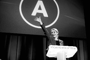 15日,丹麦哥本哈根,社会民主党党魁托宁-施密特在该党获得议会选举胜利之后对支持者发表演讲。