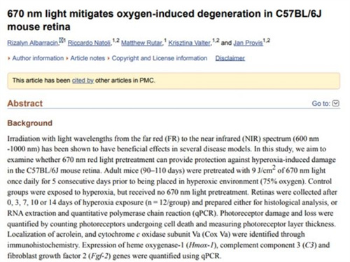 红光在护眼领域的应用,科学界正持续通过研究提供凭证。来自伦敦大学眼科研究院的一项开创性研究发现,每天透过3分钟红外波中670nm的NIR红光照射,能有效抑制并修复视网膜线粒体的受损与老化,对近视发生与加深有良好的阻滞作用,尤其是蓝光所造成的损害。