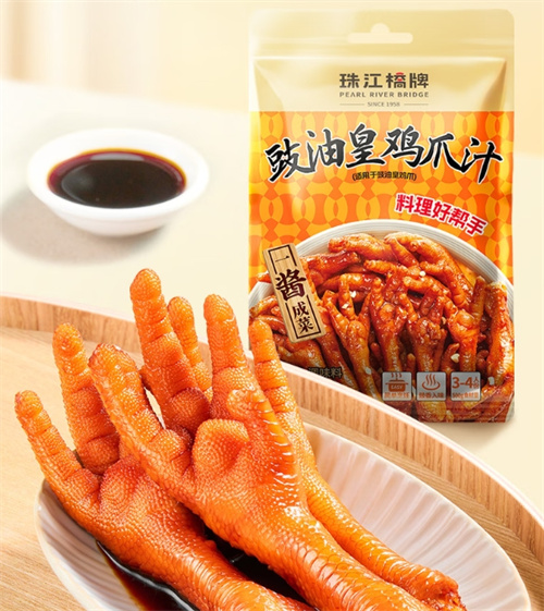 豉油皇鸡爪汁采用珠江桥特色天然晒制酱油,与香辛料协同作用,能去腥增香、豉香醇厚、天然鲜甜。准备250克鸡爪洗净剪甲,冷水下锅,加入姜葱料酒焯水2分钟,撇去血沫后过冰水。锅中放入处理好的鸡爪、添加豉油皇鸡爪汁、清水,大火煮开转小火煮15分钟,期间翻动鸡爪,关火浸泡10分钟(如需软糯口感可适当延长时间)。将煮好的鸡爪带上汁水放入便当盒,再搭配一些清爽的凉拌蔬菜,一份美味的豉油皇鸡爪便当就完成了。这粤式经典早茶菜式,色泽金黄红亮,酱香浓郁,鸡爪软糯,吮指留香,为夏日的午餐增添一抹独特的风味。