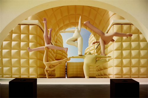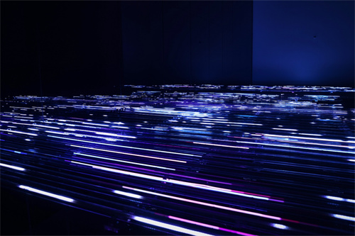 展览以 “自然—感官—梦境—秩序—文明” 为叙事主线,呈现多元艺术语汇的交响。步入展厅,观众在象征生命源起的《海洋》(OCEAN) 中直面汹涌的黑浪与震撼的声效。随后,欧洲艺术团队“光之子”的《单色光谱》借助频闪灯光与烟雾的奇妙互动,幻化出流动变幻的色彩空间。中国新媒体艺术家刘佳玉的《激流引力》则以数百条光影格栅精心构筑出流动的矩阵,巧妙模糊虚实与梦境的界限。艺术家Massimiliano Moro的作品《升腾的黄色,上升的曲线,红色的回声》运用饱和而强烈的色彩重构阴影概念,有力挑战着观众对空间秩序的既有认知。作为压轴呈现,《流动》(FLOW)通过一段超现实主义舞蹈影像,浓缩演绎艺术史的流变,最终完成对恢弘文明进程的深情礼赞。